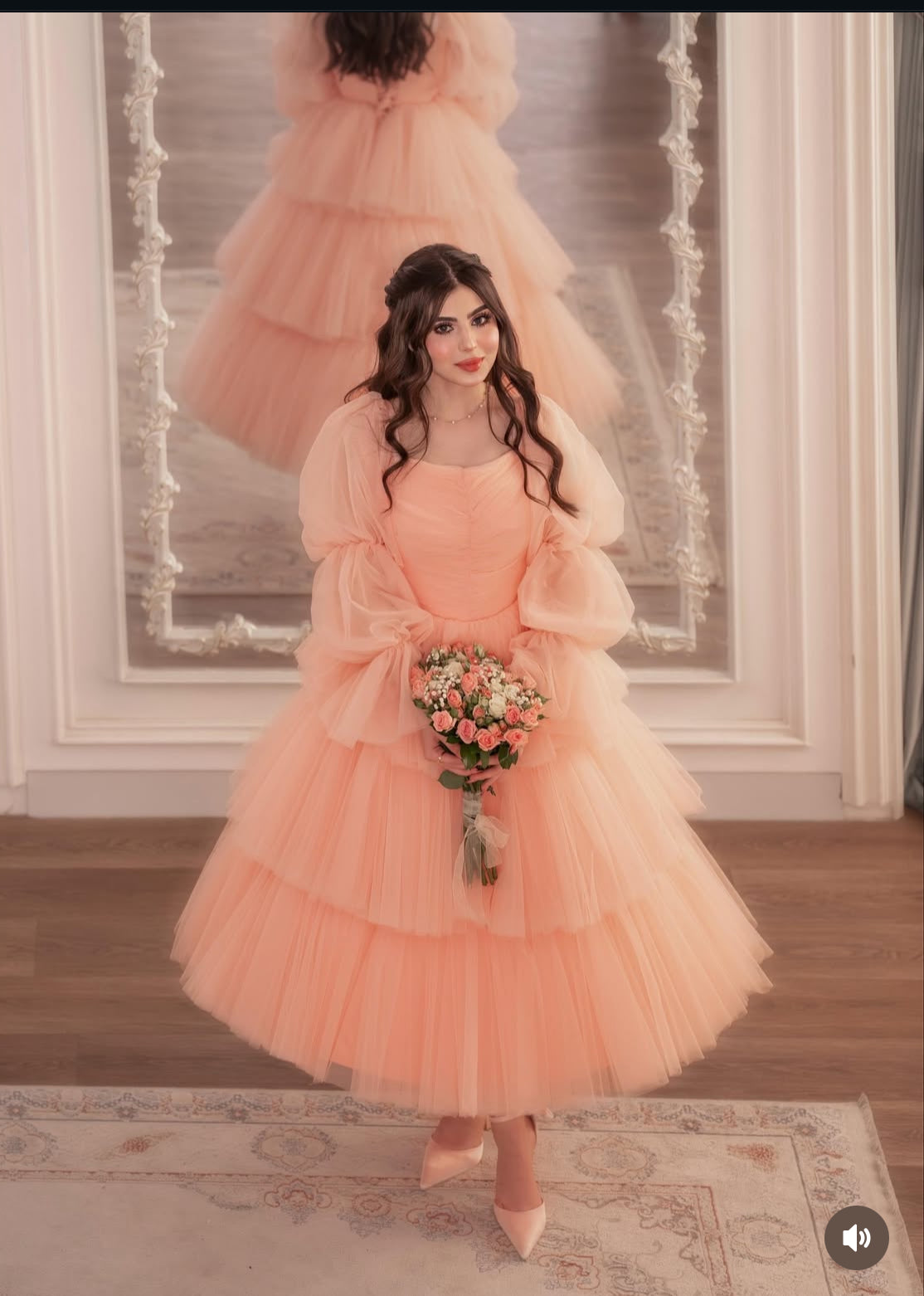 Crafted in layers of soft tulle, this gown flows like poetry in motion, capturing the glow of dawn in every fold. The voluminous sleeves add a touch of vintage romance, while the delicate corset bodice shapes a silhouette that feels both royal and ethereal.